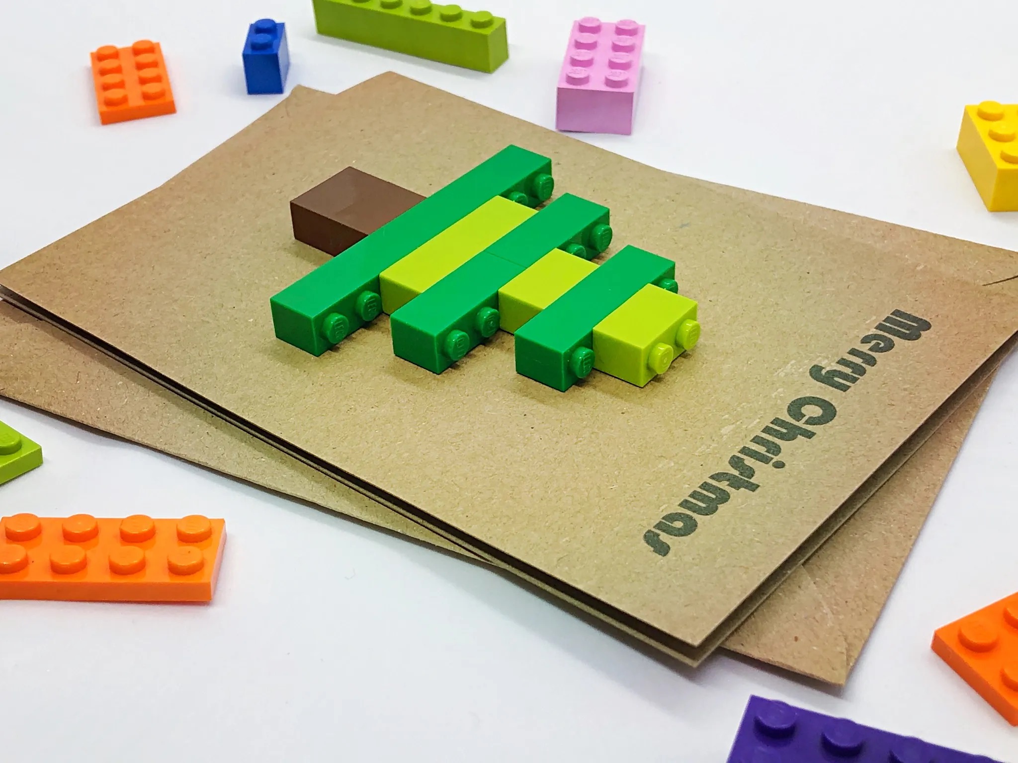 The card reads ‘Merry Christmas’ and features a Christmas tree made from 9 individual LEGO® bricks.